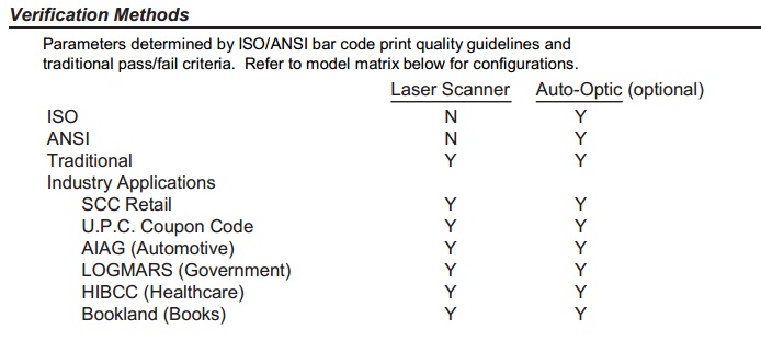 Ngược lại, RJS D4000A ngoài khả năng kiểm tra kiểu truyền thống thì nó còn cung cấp đầy đủ phương thức kiểm tra chất lượng mã vạch theo tiêu chuẩn ISO / ANSI, khi kết hợp với máy tình và phần mềm VICR, RJS 4000A sẽ cho phép in báo các chi tiết các chỉ tiêu mã vạch vừa được kiểm tra. Sau đây là bảng so sánh khả năng cơ bản của 2 máy kiểm tra mã vạch này: