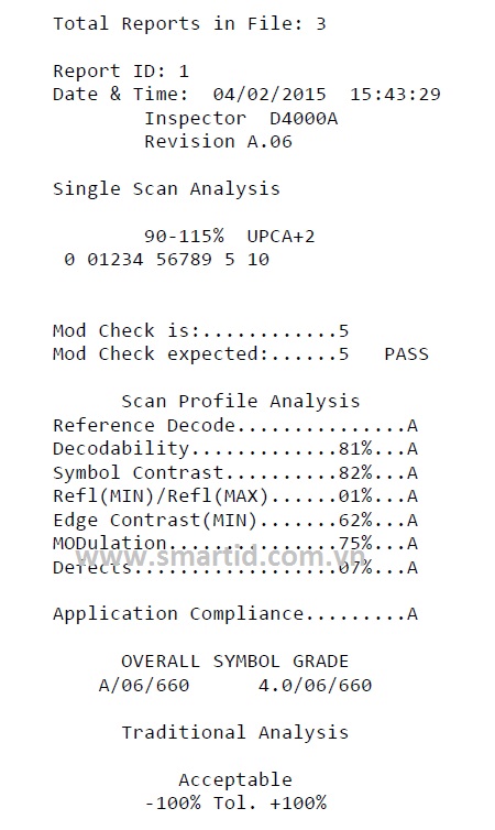 Sau đây là 2 mẫu báo cáo kiểm tra chất lượng mã vạch tương ứng của 2 loại máy kiểm tra RJS D4000L và RJS D4000A (Khi kết hợp với phần mềm VCIR qua máy tính)