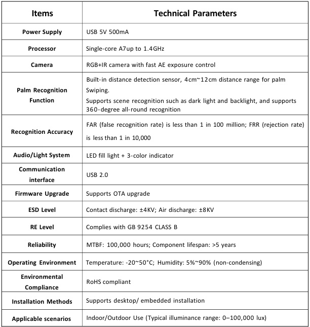- Hệ thống camera nhận dạng lòng bàn tay hiệu năng cao, tích hợp bộ xử lý ISP chuyên dụng cho chất lượng hình ảnh cao và khả năng phát hiện chống giả mạo chính xác.