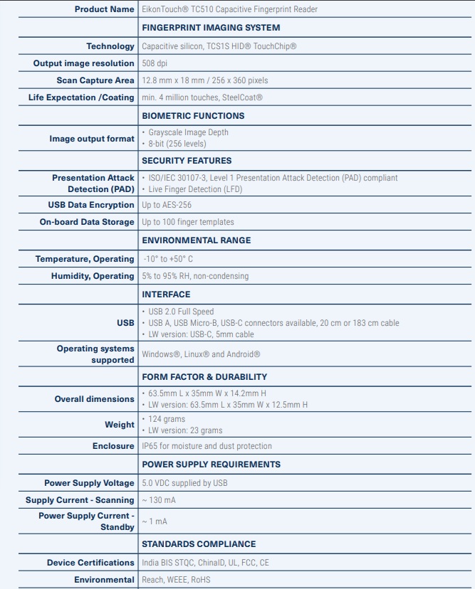 - EikonTouch TC510 sử dụng công nghệ được cấp bằng sáng chế độc quyền của HID để thu nhận các chi tiết vân tay tinh vi, cho phép ghi nhận nhiều loại vân tay khác nhau.