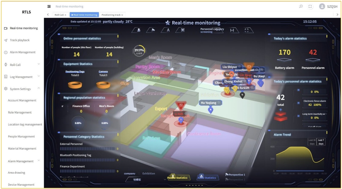 - Nền tảng hệ thống quản lý trực quan: Trang bị bản đồ vectơ 3D độ chính xác cao để đạt được các mục tiêu quản lý: giám sát vị trí theo thời gian thực, phát lại quỹ đạo lịch sử, quản lý các loại cảnh báo, điểm danh nhân sự, kiểm kê tài sản, quản lý vòng đời tài sản, v.v.