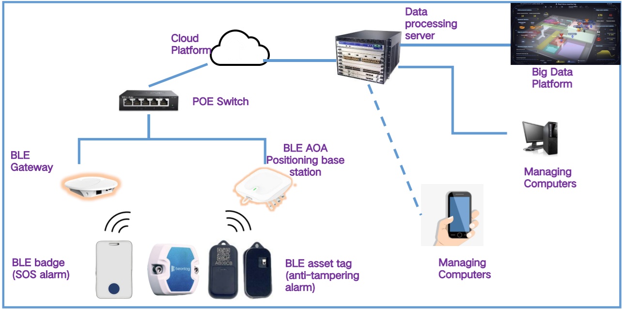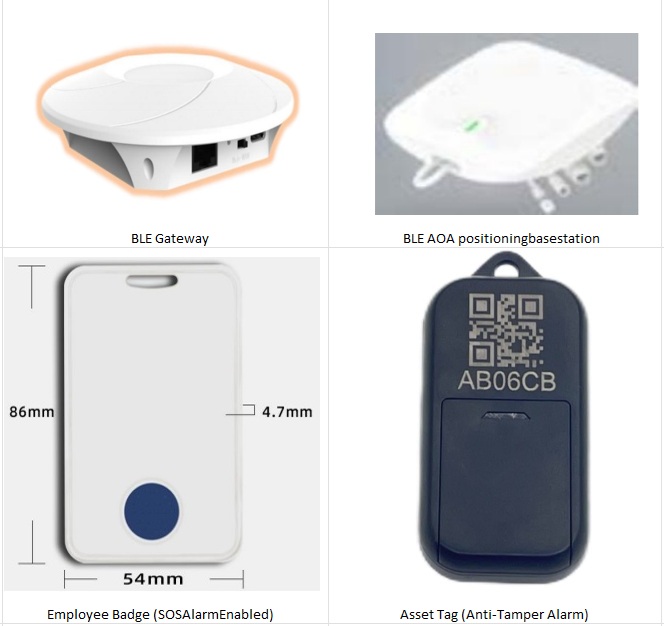 Cổng BLE có kích thước nhỏ, vùng phủ sóng tín hiệu rộng, có thể được lắp đặt ở nhiều vị trí khác nhau. Nó được cấp nguồn qua POE và có khả năng truyền thông liên tục. Thẻ BLE có pin tích hợp, kích thước nhỏ, tiêu thụ điện năng thấp, dễ dàng gắn lên bề mặt tài sản cần quản lý hoặc đeo cho nhân sự.
