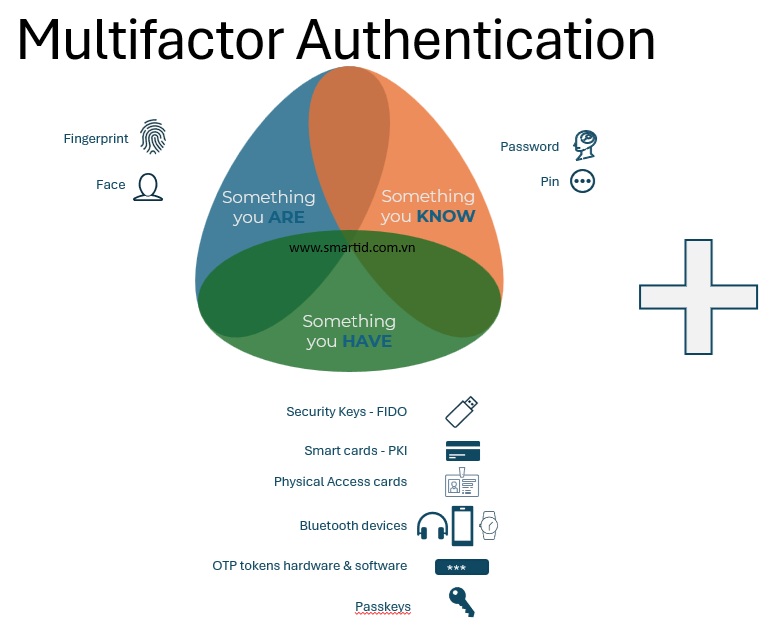 - Something you have: Security key, smart card, thẻ ra vào, thiết bị Bluetooth, OTP token, passkey