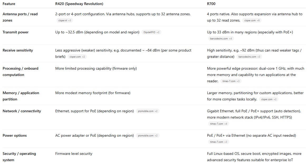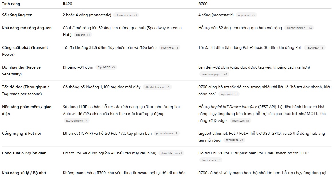 So sánh thông số kỹ thuật và hiệu năng của đầu đọc UHF Impinj R420 và R700