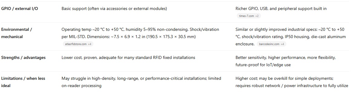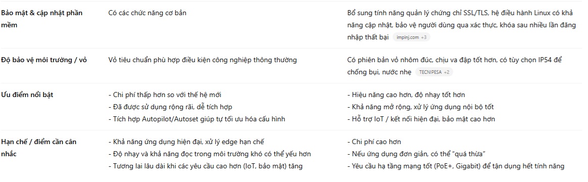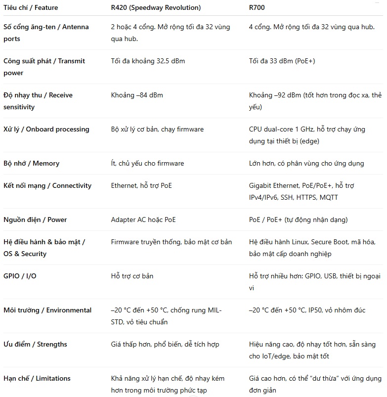 Nếu bạn cần hệ thống RFID với hiệu năng cao, độ nhạy tốt, mở rộng lớn hơn, tích hợp IoT / xử lý dữ liệu tại biên (edge), hoặc muốn thiết bị “chuẩn tương lai” với khả năng nâng cấp và bảo mật, thì R700 là lựa chọn mạnh mẽ hơn mặc dù chi phí cao hơn.